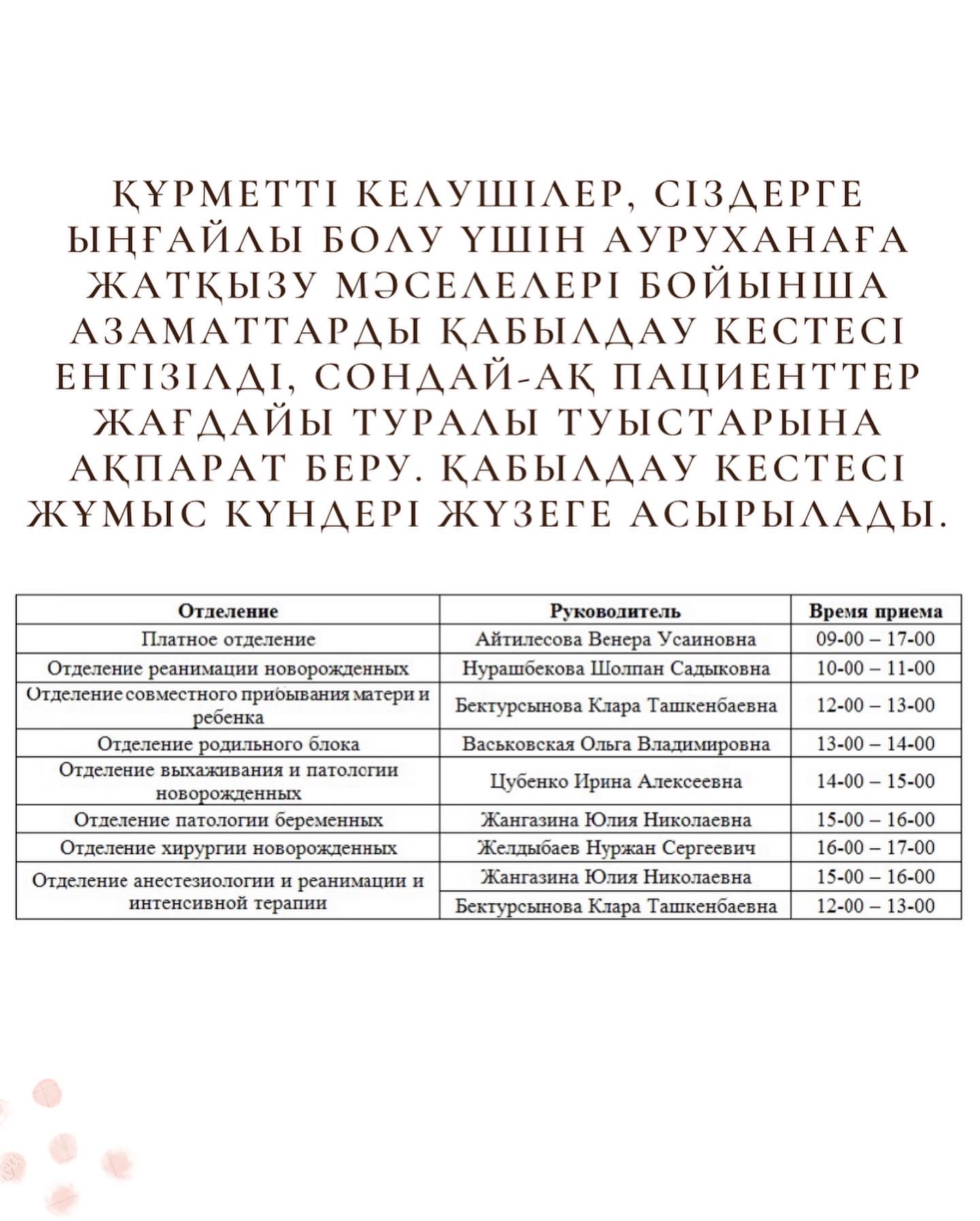 Құрметті келушілер, Сіздерге ыңғайлы болу үшін ауруханаға жатқызу мәселелері бойынша азаматтарды қабылдау кестесі енгізілді, сондай-ақ пациенттер жағдайы туралы туыстарына ақпарат беру. Қабылдау кестесі жұмыс күндері жүзеге асырылады.